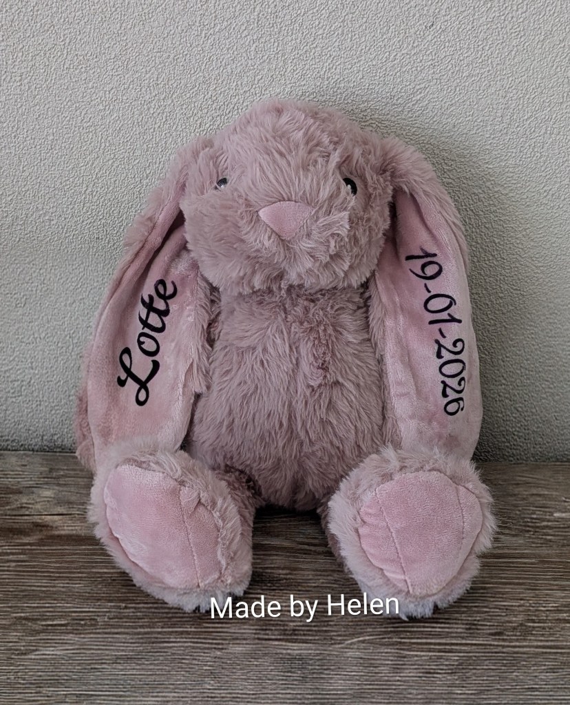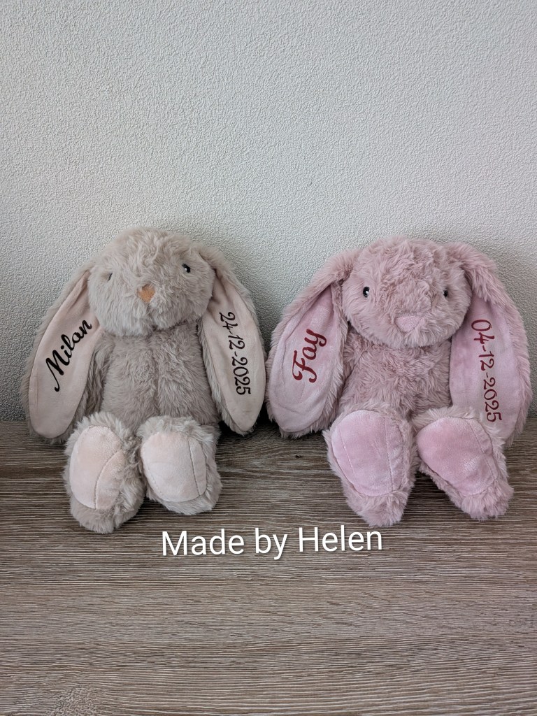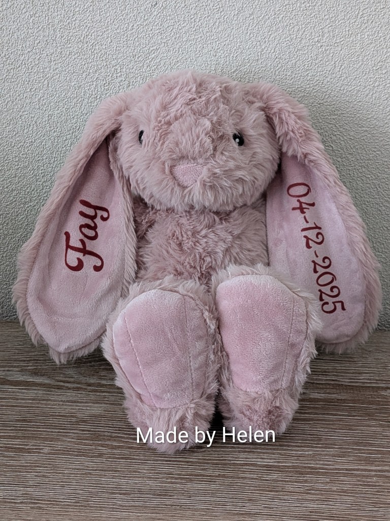 Hoe schattig zijn deze knuffelkonijnen! Vooral speciaal als de naam en geboortedatum van uw kleintje op de oren worden bedrukt. Evt andere teksten zijn ook mogelijk! De konijnen zijn 38,6cm van kop tot teen. De oren worden bedrukt middels veilige sublimatietechniek. De bedrukking is zichtbaar maar niet voelbaar! De knuffels voelen erg zacht aan.